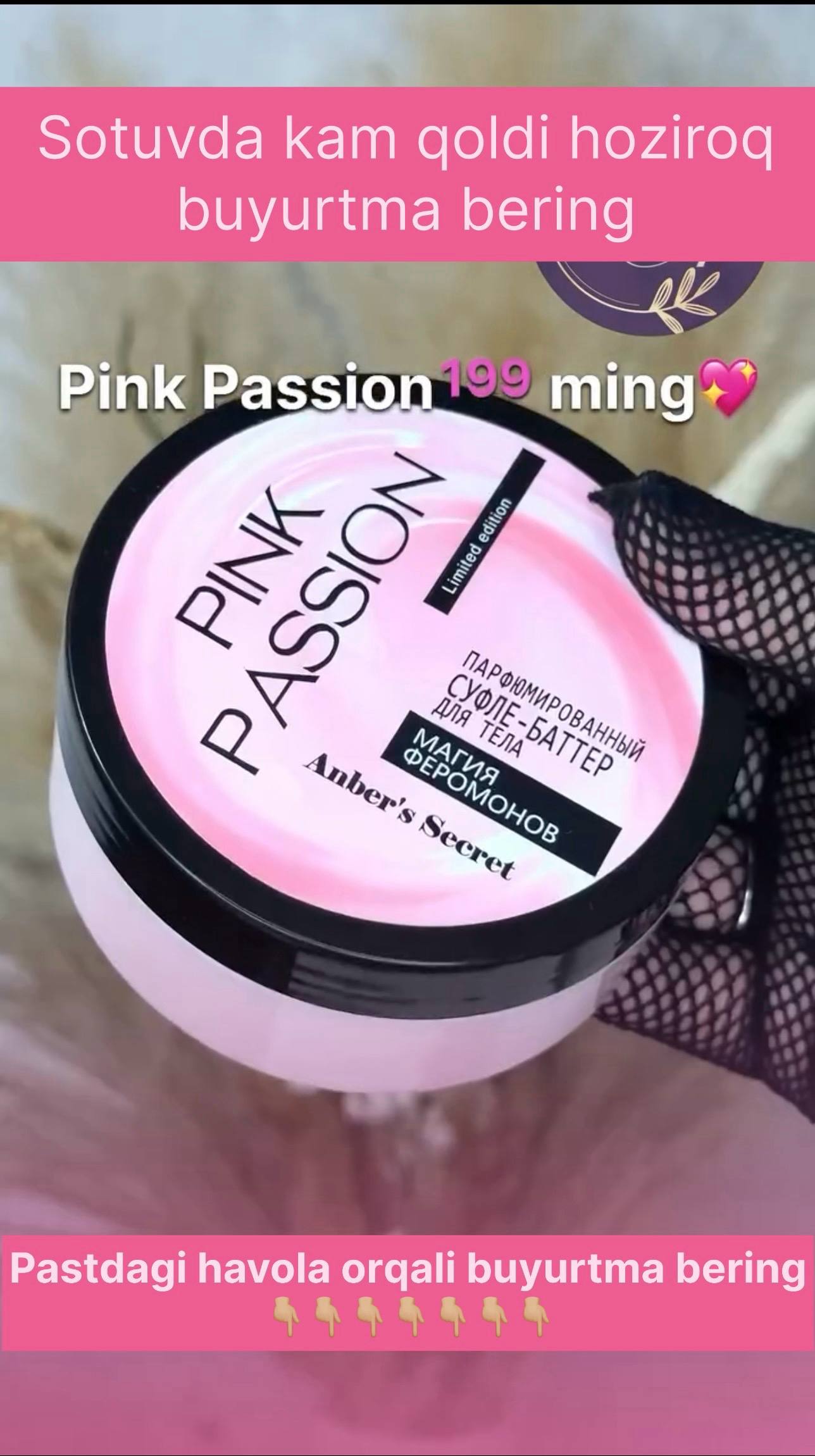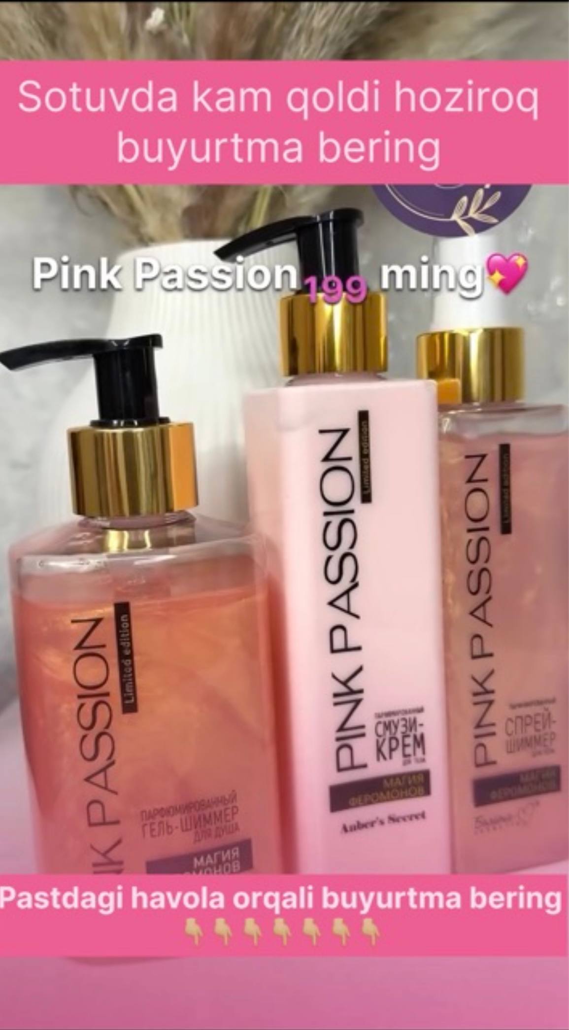 Ozini ayoligini his qilish uchun 4 talik naborimiz Pink passionga tegishli 1 yuvinish uchun shimmer gel 2 maxsus skrab badanga surtib 5 daqiqadan song yuviladi 3 smuzi krem terini namlantirib badan silliq qilishi uchun yoqimli ifor uchun 😍💋 4 sprey sepishingiz bilan yoringiz sizdan uzoqlasholmi qoladi 😘💋❤️😍